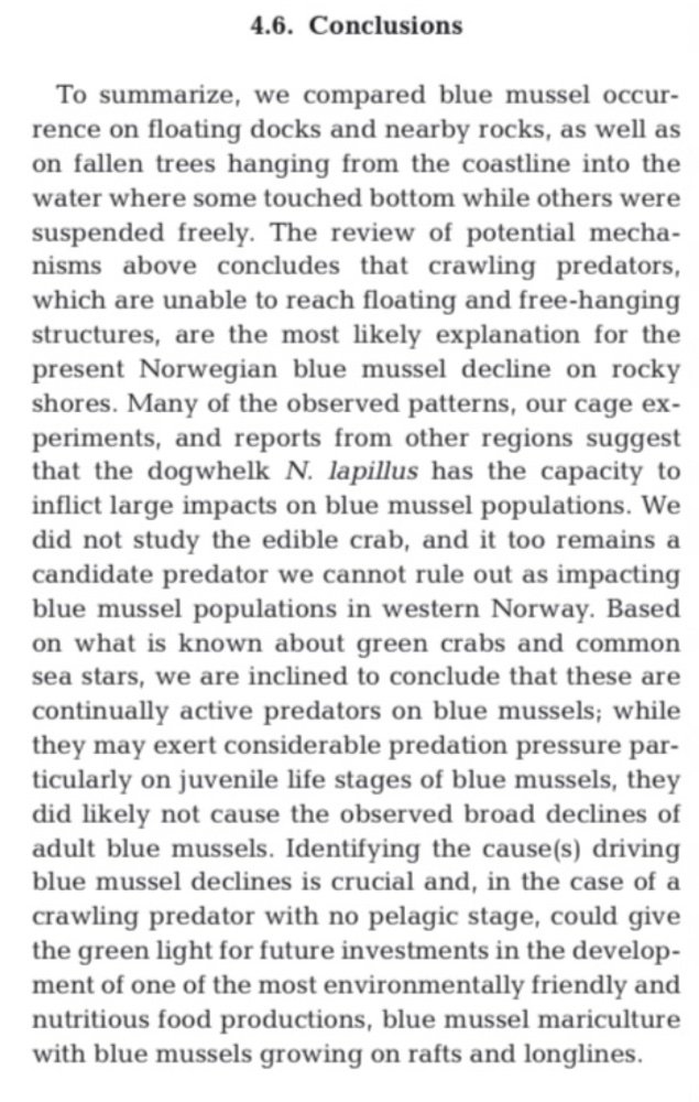 Min høyst private teori om at man stort sett bare finner blåskjell på moringskjettinger og tau, under flytebrygger og på annet tauverk som står i sjøen er at det er mye sjøfugl som beiter på skjell. Jeg lanserte den teorien for forskeren jeg snakket med i sommer, og han gikk mer eller mindre god for det. Han la også til at det er veldig mange predatorer i sjøen som beiter på blåskjell. Ved siden av fugl, nevnte han krabber, sjøstjerner, snegler og en rekke fiskearter. Det er maaaange arter i sjøen som beiter på skjell. Jeg har hatt en teori om dette, da det viser seg at små skjell som vokser på svaberget blir borte, mens skjell som vokser under flytebrygger får vokse seg store. Der er det kanskje ikke så lett for sjøfugl å komme til, og krabber, sjøstjerner og andre arter som lever på bunn ferdes ikke der. At blåskjell hele tiden har sett ut til å trives under flytebrygger spenner også bein under teorien om forurensning og global oppvarming.
