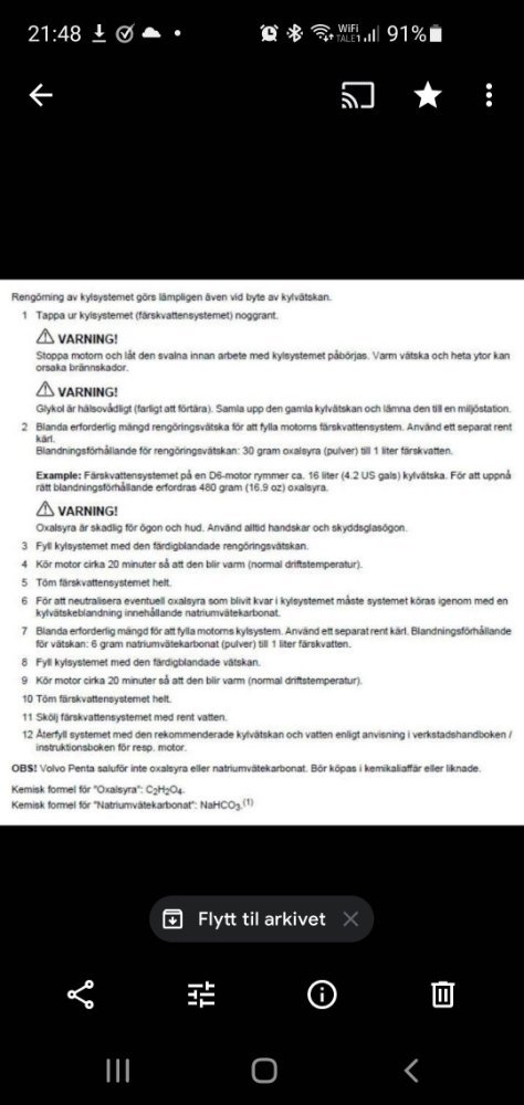 Kaskazi Svart igår klokken 11:11 Link til dette innlegget Svart igår klokken 11:11 Volvo Penta har en prosedyre på hvordan man skal rense indre kjølekrets. Legg merke til at VP anbefaler å nøytralisere syren med natron. Narton får man kjøpt i dagligvaren og oksalsyre får man billig på trevarebutikk i Sverige. 1 kg gir 32 liter ferdig syreblanding og koster omlag 250 kr sist jeg kjøpte. sap_2000 skrev for 12 timer siden: Sitér dette innlegget Link to post
