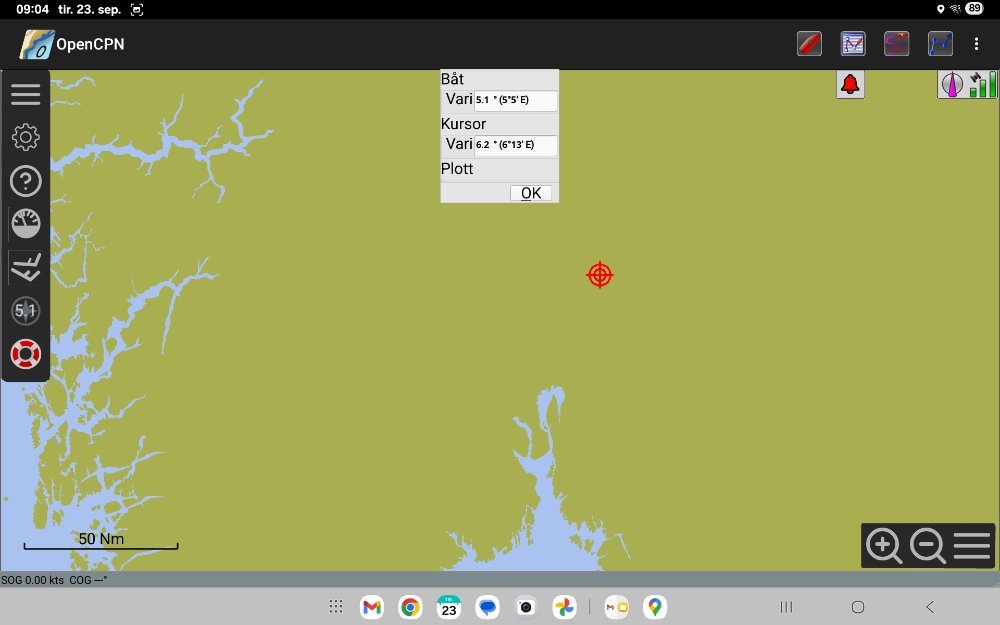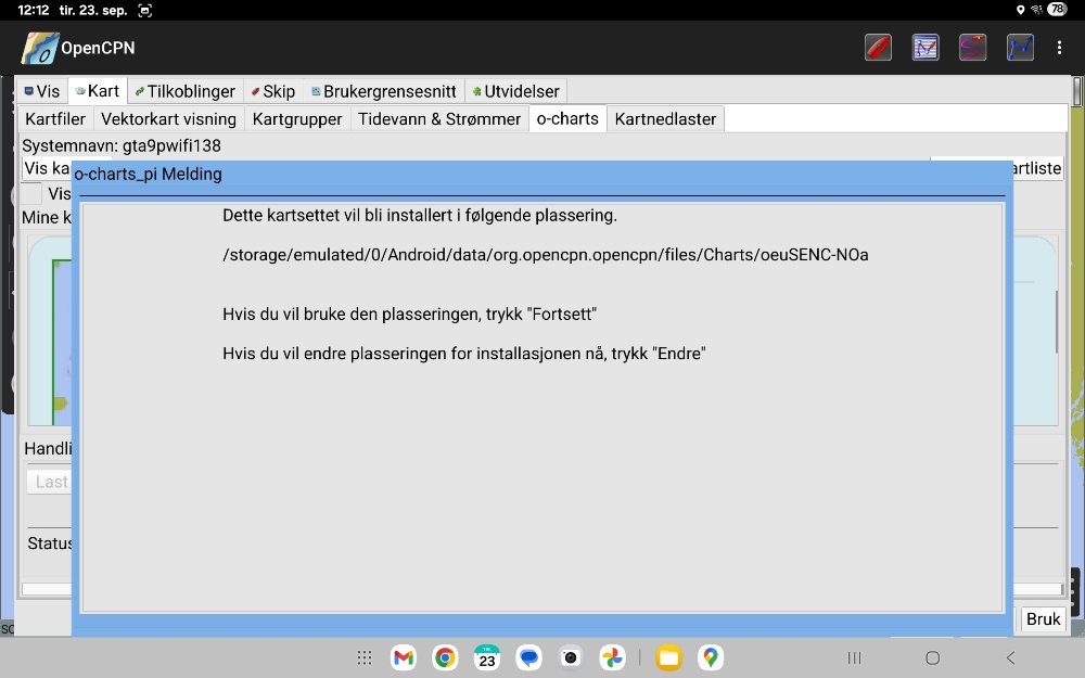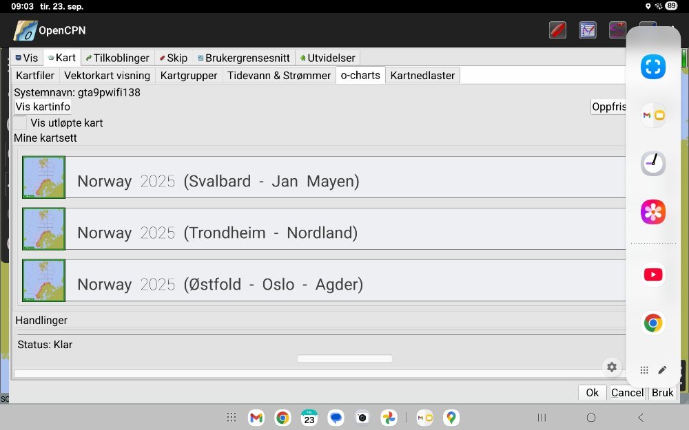 Steihy Svart 23.September Link til dette innlegget Svart 23.September Roger jo skrev On 16.9.2025 at 18.49: Da er vi heldige som har Android-telefoner og -nettbrett, som kan lastes ned OpenCpn fra Google Play Store Og kart No, SE og DK for 99,20 € fra https://o-charts.org/ Jeg finner ikke ut av dette. Lastet ned programmet, og kjøpte Norge i 5 deler på o-charts. Fått de over, sånn at de er på lista i programmet, med status "Klar". Det har kommet opp et koordinatfelt, men fremdeles bare bakgrunnkart. Det er en eller annen aktivator jeg ikke finner. Sitér dette innlegget Jeg vil bo i sjøbod og gå i gubbdagis. Link to post