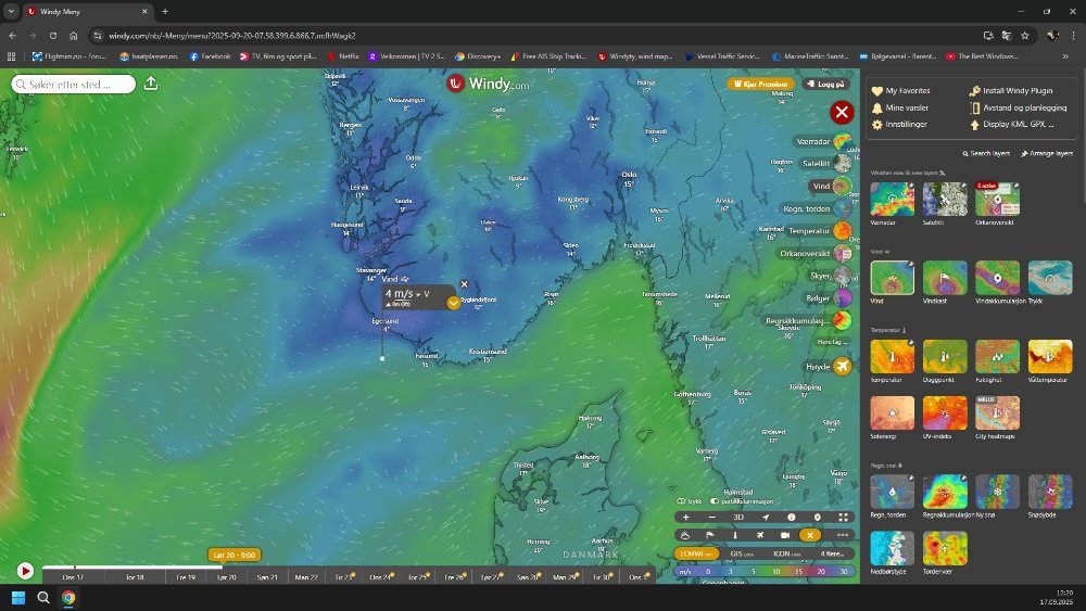 Steihy Svart 17.September Link til dette innlegget Svart 17.September (redigert) Ryste skrev for 20 timer siden: For meg ser det ut som om 25., 26. og 27. er gode dager å reise på. Det er for langt frem i tid i alt annet enn veldig stabile værtyper. Vi har generelt mer usikkert vær enn før, og høst er høst. Min erfaring er at du skal slite med å finne et sikkert værvindu på 3 dager i det hele tatt på den tida, før du nærmest er i det. Noen spørsmål: Det er ca. 260 nm. pluss landkjenninger. Marsjfart? Må du gå hele turen i ett, eller kan den deles? Jeg mener ikke i ett, som uten nattestopp, men som tre dager i strekk. Hva menes med "så rolig som mulig"? Det er stor forskjell på akseptabelt vær sikkerhetsmessig, og maks vær. Maks vær rundt hele, eller over alle de utsatte strekkene uten mulighet for å dele opp, da skal du ha veldig flaks på den tida. Når jeg planlegger tur eller neste etappe, begynner jeg enkelt. Jeg liker VG appen pent.no fordi den stiller opp Yr og Storm ved siden hverandre. Dersom de er ganske enige for perioden, går jeg videre. Dersom de spriker vilt, vet jeg at været er uforutsigbart, og i realiteten ikke lar seg melde. Det er ikke noe poeng i å lure på hvem som treffer best. Det samme gjelder om du bruker Windy. Den visualiserer bedre, men har ikke nødvendigvis bedre rådata. Gjør det samme og skift mellom alle algoritmene/modellene. Er de ganske like for perioden din, har du værmelding. Spriker de mye, har du ikke. Da er det på "se ut vinduet" nivå. Skulle sagt litt til, men blir avbrutt. Redigert 17.September av Steihy (see edit history) Sitér dette innlegget Jeg vil bo i sjøbod og gå i gubbdagis. Link to post
