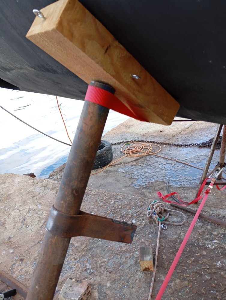 tobixen Svart 24.September Emnestarter Link til dette innlegget Svart 24.September Krybba ble ferdigstilt i går. Jeg hadde tenkt til å be noen om transporthjelp, men kantprofiler er lett komprimerbart og jeg følte jo heller ikke behov for å kjøpe de tyngste de hadde i butikken - så det tok jeg lett på sykkel - sammen med en bursdagsgave fra Decathlon. Sluttresultatet, fra styrbord akter og mot klokka: Over: aktre styrbord støtte. Dette er et par justerbare støtter, men satt opp veldig simpelt. Mye vertikal støtte, ikke så mye horisontal støtte, men støttepunktet er trolig over tyngdepunktet, så da gir den vel noe beskyttelse mot velt allikevel. Disse støttene støtter omtrent køya mi - når hekken bare har "hengt"med nærmeste støttepunkt nært kjølen, så har jeg tidvis merket ganske mye vibrasjoner f.eks. ved vind i lufta. Med solide støtter her antar jeg at jeg kan sove bedre. Treklossen står helt normalt på skroget, dvs at treklossen kommer til á falle ut dersom den beveger seg i noe retning. Treklossen er til en viss grad sikret med hyssing. Idéelt sett skulle disse to støttene vært festet med fire kantprofiler, en relativt nært bakken, en relativt høyt oppe, og to i kryss. I stedet er de festet i underkant med en relativt stram lastereim, og i høyden med et flatt stykke metall. Skulle toppen av støttene finne på å bevege seg mot hverandre, så vil metallstykket her flekse. Ikke idéelt, men jeg regner med at det holder til jeg er tilbake. Med tolv støtter så skal dessuten båten teoretisk stå solid selv om seks av dem faller ned. Neste støtte ble festet med sin makker på andre siden før båten kom opp. Jeg har nevnt lengre opp at dette var en tabbe: Ifht båtens lengdekase, så ble støttenstående vinkelrett - men båten buer jo, så det ble feil vinkel mot båten. Presset fra båten går aktover, dette medfører et dreiemoment på støtten. Jeg har satt inn en vertikal skrånende kantprofil for å ta opp noe av kreftene fra båtskroget. Denne er så forankret i aktre støtte. Denne forankringen be litt jalla, men solid nok. Midtpunktet berørte bakken. Jeg prøvde å feste en stram snor mellom første og andre støtte på styrbord side, men støtten begynte å bevege på seg. selv etter å ha skrudd til støtten temmelig hardt så oppdaget at ingen av de bena på bukken var i berøring med bakken! Jeg hamret inn en trekile for å forebygge dette. Jeg har også strammet opp bunnen av støttene mot hverandre med et riggtau: Sammenkoblingen mellom støttene fungerer jo tilsynelatende meget godt, men det burde vært stål i stedet for tau langs bunnen, og dette burde kommet på plass etter båtløft for å få vinklene korrekt Det er ikke jeg som har laget disse hullene. I går fikk jeg besøk av en Ukrainer som hjalp til i et par timer, meget mer effektivt å jobbe med fire hender og to hjerner i stedet for én, og han var ivrig etter å ta over sveisingen, men etter et mislykket forsøk på å feste en støttebjelke her så tok jeg tilbake kontrollen over sveiseapparatet Neste støtte er en simpel greie, metallrør av fast lengde, trekloss som står løst mellom kloss og rør, Stammet opp vha jekkestropper og ved å hamre inn kiler langs bakken. Her er igjen klossen normalt på båtskroget, det hadde vært smartere å sette klossen litt høyere på skroget, da kunne man strammet opp med jekkestropp også på toppen. Legg merke til kantprofiler av nytt stål, med trekantfeste, dette er arbeidet som ble gjort i går. Jeg hadde opprinnelit en tanke om å ikke svekke røret ved å lodde rett på røret, men min ukrainske medhjelper så ikke noe grunn til ikke å la det være en liten sveis mellom kantprofil og rør. Det kunne også vært en idé å drillet et hull i "ermet" som er brettet rundt røret og så sveise metallermet fast i røret gjennom dette hullet. Denne støtta føler jeg at står fjellstøtt. Det er også noen av de mer solide støttene. Den er forankret til undersiden av kjølen, både med stålskinner, diagonalt rør og diagonalt tau. Stålskinnene er imidlertid ikke malt, så det er jo en risiko for at de ruster opp ila vinteren. En nabo fortalte meg at under kraftig pålandsvind så hendte det at hele området ble oversvømt med saltvann. Den femte støtten er den jeg tror kommer til å rase ned først. Vinkelen ble litt gal, treklossene står for lavt på båtskroget ifht foten - ref håndtegnet skisse over med påskrift "nei, nei, nei!". Jeg tror støtten allerede har beveget seg noen millimeter ila de siste dagene. Festepunktet for jekkestroppene burde nok også ha vært levere på støtta. Støtten kunne også med fordel vært forankret til skinnene som går under kjølen. Og da er vi kommet til baugen. Denne støtta er ikke med gummi og ikke forankret til kjølen, men jeg tror ikke den kommer til å bevege på seg - støttet opp både med stål og jekkestropper til motpart på andre siden. Denne har en god vinkel og er strammet opp med jekkestropper både i høyden og langs foten. Anker og kjetting tok jeg ned for å gi en ferskvannsskylling - men jeg burde nok flyttet det litt lengre vekk fra sjøen. Også burde jeg låst det fast ved å sveise en metallskinne fast til støttene i stedet for å bruke en sykkellås som kanskje er rusten og ubrukelig når jeg kommer tilbake. Nabvosttta på babord side er litt mer "jalla"> simpelt stålrør og kloss, holdt på plass med vinkling, jekkestropper høyt og lavt, samt hyssing og kantprofil. Det var noe som ikke føltes helt riktig ut når denne konstruksjonen med korte kantprofiler var sveiset fast - dagen etter ser jeg helt klart at det skulle vært minst ett til kort stykke med hjørneprofil her for å lage en slid konstruksjon. Dette er babord parnerstøtte til den støtta som kan rase ned på styrbord side. Det er en solid støtte. Froankringen til stålskinnene under kjølen er imidlertid noe jalla og kunne med fordel vært forbedret. Jekkestroppingen langs bakken vil jo feile