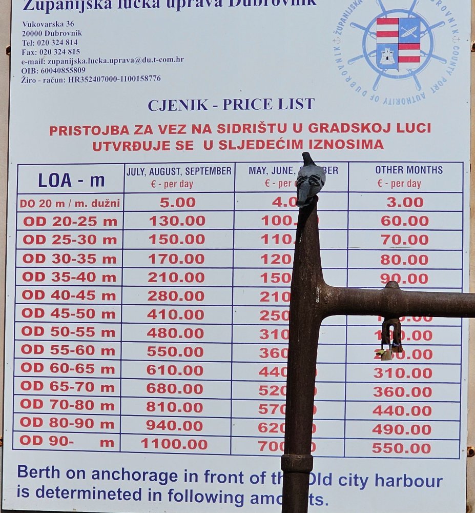 TerjeFjern Startet 26.September Link til dette innlegget Startet 26.September Ser av prisene i Dubrovnik at de nok har større båter på besøk enn de fleste av oss har. Under 20 meter koster ikkenoe omtrent. Sitér dette innlegget Link to post