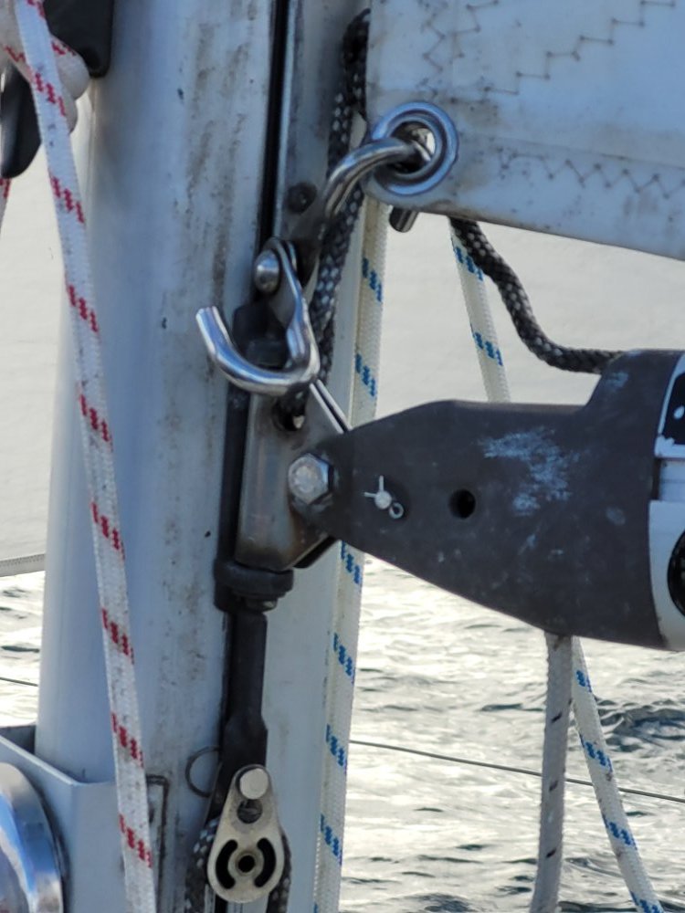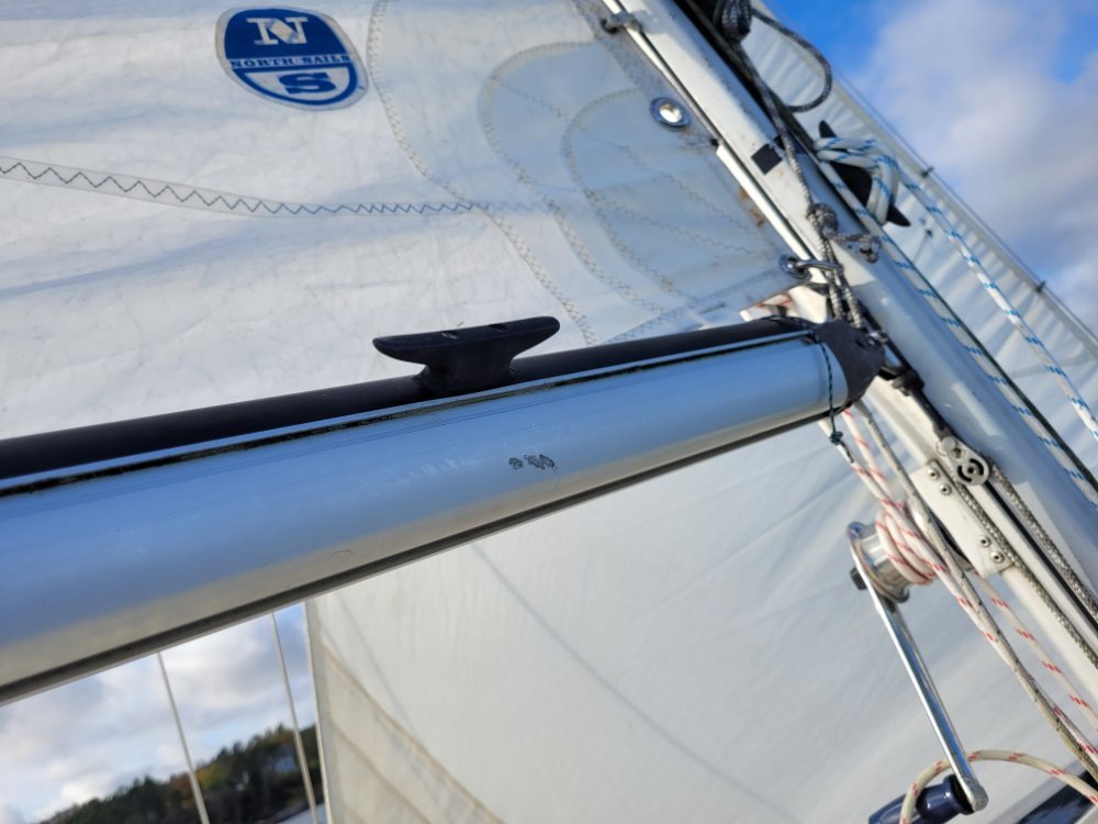 Diskusjonen var altså om øyet kunne brukes som blokk, @Code0. Og det er justerbart, går i et spor og låses med en setskrue ser det ut til. Men en kan jo også tilpasse ved å la linen gå fra øyet, opp i maljen og ned til enden av bommen, hvis en vil flate seilet mer. Eller rett ned med feste rundt bommen, hvis en vil flate mindre. Seilet skal normalt strekkes bra akterover og flates, siden det stort sett er i mye vind det reves.