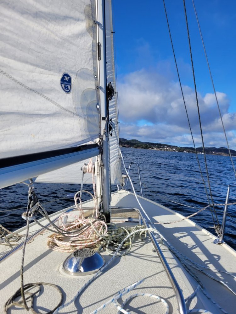 Med tid og stunder skal fallene føres til cockpit, men da må jeg også ha ny sprayhood med maljer som fallene kan føres gjennom. Da kan kanskje revingen få en ny vurdering. Trur eg.