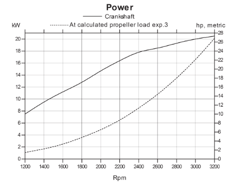J-Å Svart 20 timer siden Link til dette innlegget Svart 20 timer siden I tabellen over tok jeg ut i lavest mulig toppturtall på propell med gammel motor. Jeg har ikke sett høyere giringer enn 3.0, så jeg brukte da 1000 rpm. Jeg heller stadig mer til at motoren ikke leverer full effekt. Dette diagrammet viser at den skal klare 18Hk allerede ved 1900 rpm, altså propellturtall 720 RPM. Hvilken båtfart får du ved 1900 RPM? Får du svart eksos når du gir maks gass og går på 1900 RPM? Sitér dette innlegget Link to post