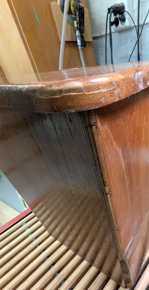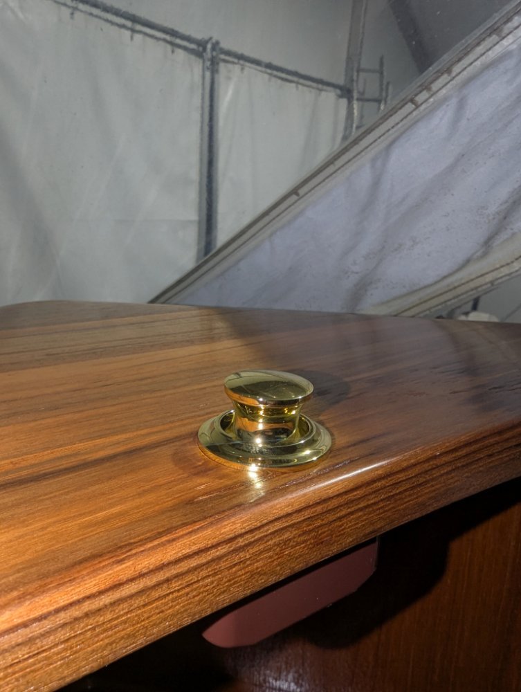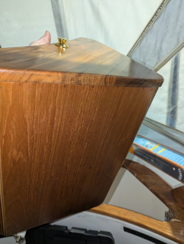 Før og etter av barskapet 😊 det var sterkt flasset og skader i lakk og treverk . Knappen var knekt også så ble nye fra Aliexpress og dem var overraskende bra! Legger ved link om flere vill kjøpe