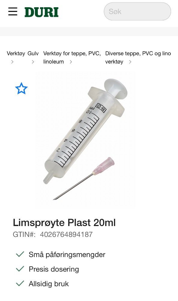 Boatmad Svart 10 timer siden Link til dette innlegget Svart 10 timer siden Boatmad skrev 2 minutter siden: Limsprøyte fra Duri. Gulvlim Sitér dette innlegget Link to post