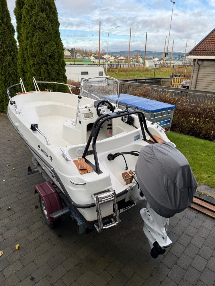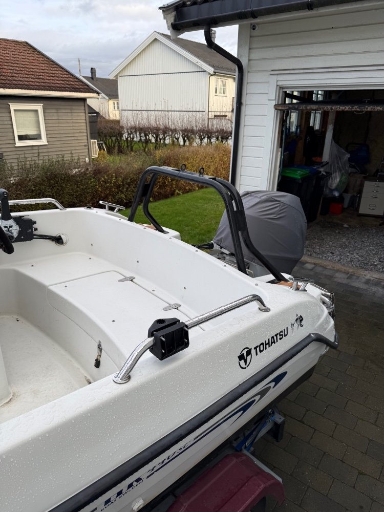 ko-stens Startet Tirsdag 13:24 Link til dette innlegget Startet Tirsdag 13:24 Ja, du leste riktig! Det er faktisk en veltebøyle til en gammel pick up! Har savnet noe å henge ting på, som stangholdere for å rydde opp i stangkaos, og led-lys/arbeidslys, men det finnes ikke noe å få tak i til denne båten, en HR 440SC. Å kjøpe ny er mer eller mindre uaktuelt, da en som kan se ut til å passe neppe gjør det og derfor må modifiseres, samtidig som prisen er høy. Så kom jeg over en billig veltebøyle på Finn… Den så fin ut og var ikke så voldsom. Altfor bred, men resten kunne passe, med litt kapping og sveising! Jeg vil ikke ha den veldig høy, ikke så bred pga badestigen og ikke for dyp. Denne kan jeg huke av alle punktene med. Eneste ulempe er at det er veldig kraftige saker. Rørene er 40 mm og ca tre, fire mm tykke i godset. Nokså tung, men ikke for tung heller, synes jeg. Vel vel, jeg tok sjansen og hentet den, siden den ikke var langt unna. Tok av en kjapp og uryddig halvmeter, som må justeres før sveising, for å se hordan det kan bli. Jeg skal kappe vekk stålet mellom rørene nede, så får jeg se ellers om hvordan lage til boltfester. Det er ett grovt hull ved hver fot. Det kan holde med solid base under dekket, vil jeg tro. Skjult hadde vært kjekt, men tenker å trekke kabler inni rørene til lamper. Da kommer fort boltene i veien, men får gruble litt på det. Jeg er veldig langt unna ekspert på sveising, så kanskje greit å gjøre det enkelt! Selvsagt burde bøyla vært i krom, men siden det også er svarte detaljer ellers, blir det kamskje ikke så voldsom kræsj heller. Men ser dette for gæli ut, eller er det innafor!? Ville dere gått videre med dette!?😬 Måtte stable opp litt treverk for ikke å få knekk på midten. Bare tapet sammen rørene! Sitér dette innlegget Link to post