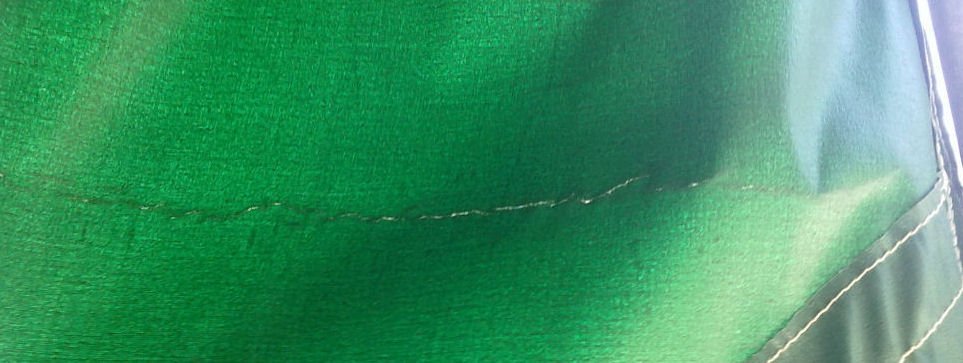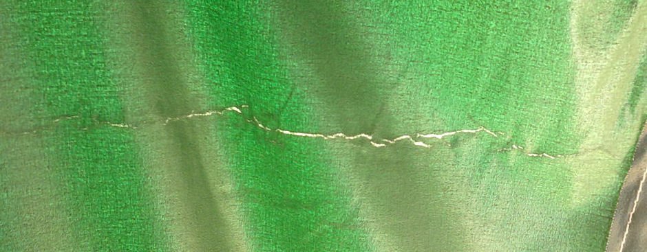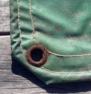 Biltema-presenningen hadde noen skarpe bretter, så nesten ut som om den var brettet sammen før PVC'en var skikkelig størknet. Her revnet den delvis. Etter 8 år var presenningen kassabel.