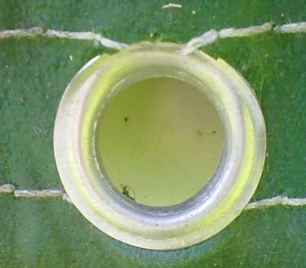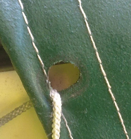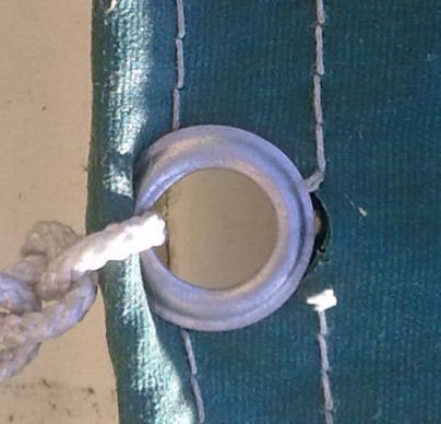 Maljene er med 1 meters avstand. Jeg er så lei av ringer som revner duken. Jeg har I tillegg pressa på maljer i mellom, så jeg har feste på hver 1/2-meter. Kun strikk/stropp der, ellers faste stramme tau i de gummiarmerte.