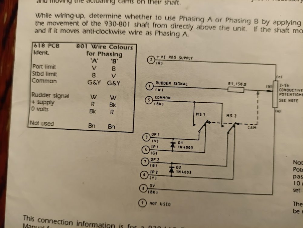 Ut fra bildet og skjemaet må jo rød (R) og sort (Bk) være endepunktene på potmeteret og Hvit(W) ‘wiper’. De ses jo også på toppen av potmeter/rorføler og føres videre i egen svart hylse. Så disse tre burde tilsvare de som føres til autopilotcomputer. Men det kan jo være at selve potmeteret har en annen resistans enn det som er vanlig? Mener jeg har sett flere steder at 5 kOhm er typisk. Ville målt motstand mellom rød og sort ledning, og så mellom sort/rød og hvit mens potmeter/rorføler dreies til endeslag begge veier. Men uten dokumentasjon blir det jo gjettverk mhp hvilken motstand autopilotcomputer ‘forventer å se’ da. Har autopilotdisplay noen form for utlesning av rorvinkel?..