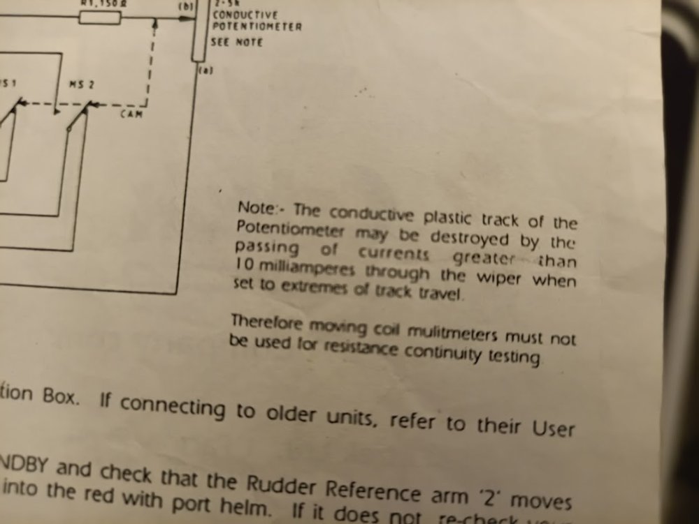 Jeg kan ikke huske at displayet har noen form for angivelse av rorvinkel. Jeg er heller ikke sikker på om autopiloten noen gang har virket. Forrige eier sa at han ikke brukte  autopiloten, fordi den styrte litt  i hytt og pine . Jeg har også flere stedet sett at 5 kohm er nevnt i forbindelse med testprosedyre av slikt utstyr. I manualen står flg. text om testprosedyre, jfr, foto