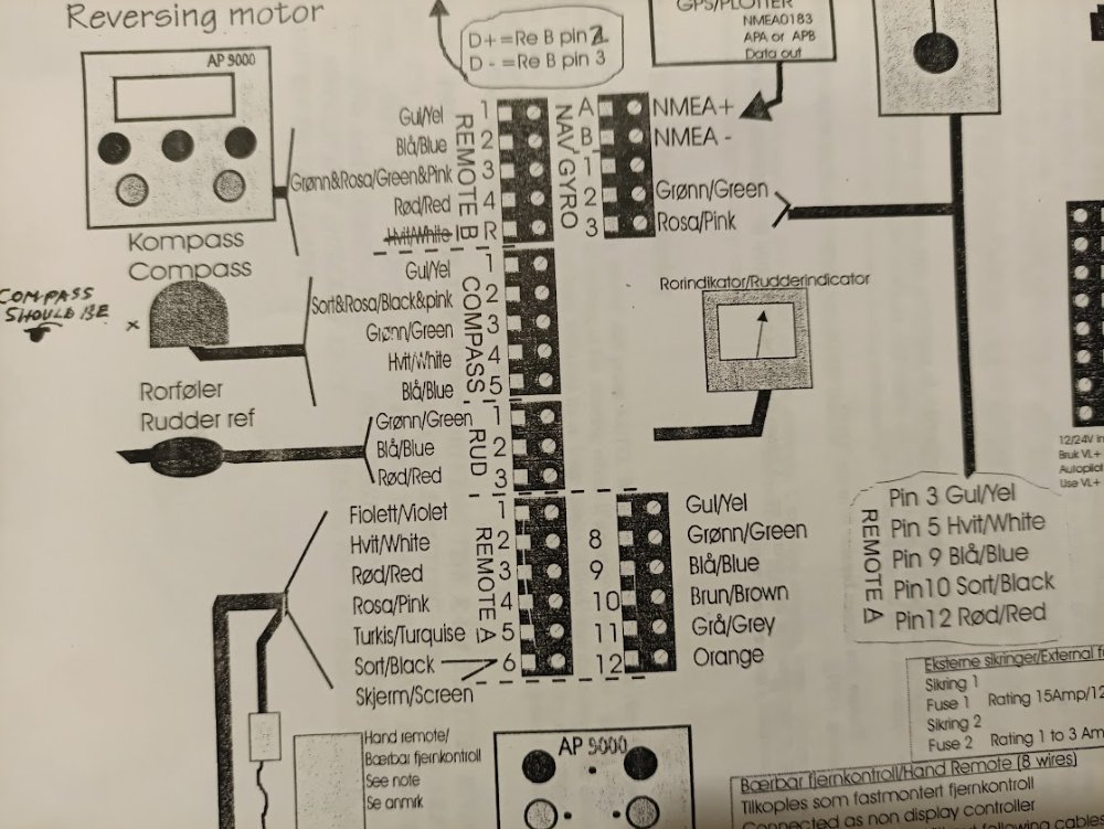 Ok, da gjør jeg et forsøk på å feilsøke. Jeg har lest meg opp litt på  mulige feilkilder i et slikt system og det fremstår for meg som at det kan være rett, det som har blitt sagt om mulig feil i rorsensoren.  Bildene fra styringstavla viser at det skal være 3 ledninger fra rorindikatoren. Dette er i tråd med det som tidligere er sagt i tråden. Alle rorindikatorer, som jeg har googlet fram, har også 3 ledninger og blir beskrevet som potensiometer med variabel motstand.  Da jeg demonterte "min" rorindikator så var den selvfølgelig annerledes . Det viser seg at det er rorindikatoren fra det gamle opplegget som var Cetrek 747, og rorindikatoren heter 930-801. Der var det slik bildet viser, en masse ledninger. Mikrobrytere som tydeligvis begrenser Styrbord og babord , men også flere ledninger som jeg ikke kan finne ut av. Ledningen fra rorindikatoren er tydeligvis skjøtet inn på annen ledning frem til styringstavla, for som det fremgår av foto så stemmer ikke farve/tverrsnitt med det som går inn der. Jeg tror vel at de som monterte dette mente at de hadde funnet de tre ledningene som bare regulerte den variable motstanden og koblet disse inn på Styringstavla. Er det noen som har en formening  om hvem ledning som skal inn på de tre punktene på styringstavla, og eventuelt hvordan man kan måle om potensiometeret er i orden, jfr. foto