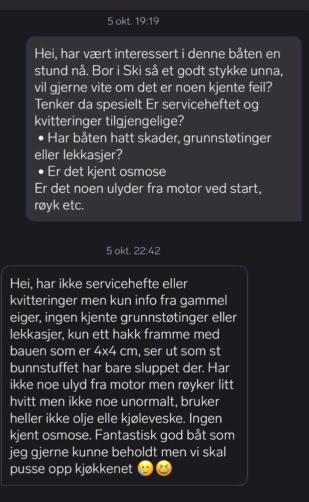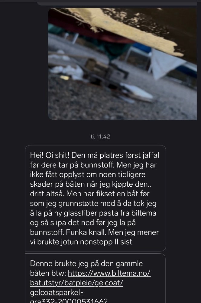 Proppanelli Svart Tirsdag 09:32 Emnestarter Link til dette innlegget Svart Tirsdag 09:32 Hei, ja forstår jeg har undersøkelsesplikt og jeg har spurt og forhørt meg over melding, men syntes dog det er litt rart om selger har utført alt som står i annonsen og ikke oppdaget dette? Dersom det er en sprekk langs kjølen er jo båten i betydlig dårligere stand enn hva som har blitt forevist. Selger har jo også dokumentert følgende i annonsen: Mai 2024: Ny motorolje og oljefilter Ny olje på drev Ny bunnsmøring Polert og rubbet Dersom de påførte ny bunnsmøring i 2024 og det da ikke har blitt sett er det jo og litt rart. Dette var jo såklart en båt jeg ønsket å ha i flere år dersom båtlivet faller i smak (dette er jo trossalt den første båten jeg har kjøpt). Kommer til å reise ned der den står lagret i da og undersøke denne sprekken mer. Sitér dette innlegget Link to post