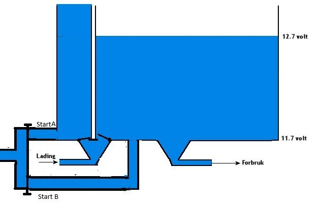 J-Å Svart 13 timer siden Link til dette innlegget Svart 13 timer siden Ingar skrev 10 minutter siden: Man bør ha én dynamo for hvert batteri også?.. Alle batterier som lades/utlades i parallell må være basert på samme teknologi, AGM. bly-syre etc. Ja, men man kan simulere to dynamoer ved å bruke DC-DC lader på forbruksbatteriet. Eller forbruksbanken. For man kan godt ha flere batterier med samme teknologi i parallell ja. Men her var det vel snakk om å holde startbatteriet oppladet og i god stand. Da er det greit å ha en egen lader på det, så man får påbegynt lading med en gang. En felles lader med flere utganger vil tilsvare å tette åpningen, og sette enveisventiler fra laderen inn på hver tank, og flytte forbruket inn på den store, slik at bare den tømmes, og den andre blir stående full. Da er det vel også lett å se hva som skjer hvis en åpner opp mellom batteriene med "1+2". En forbruksbank vil gjerne ha flere utladninger på grunn av at forbruket varierer. Hver gang det har vært en forbrukstopp som har trukket ned spenningen, vil laderen fortsette opp til absorbssjonsspenning, før den går ned igjen til "float". Med en felles lader vil også startbatteriet bli trukket opp til absorbsjonsspenning hver gang, selv om laderen har flere utganger. Sitér dette innlegget Link to post