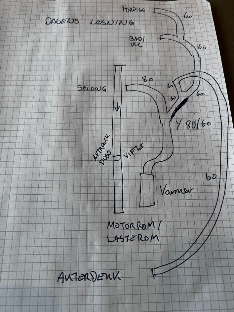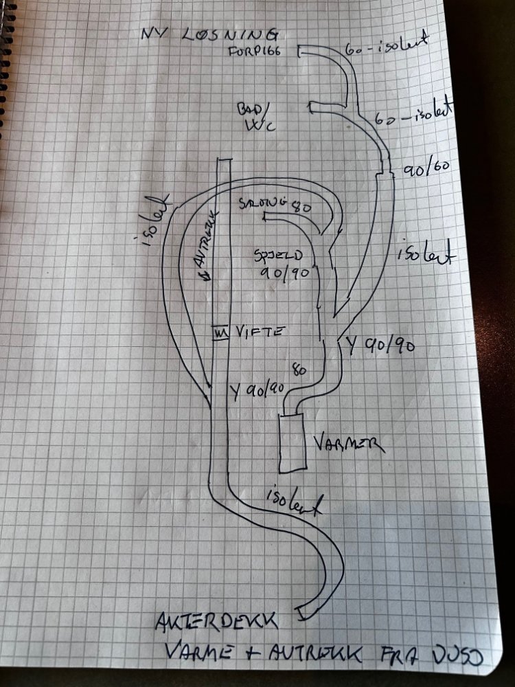 bjoris Svart Lørdag 23:11 Emnestarter Link til dette innlegget Svart Lørdag 23:11 Ja, da forstår jeg. Du har altså salong og akterdekk på en krets slik at du ikke kan få all varme ut på akterdekket? Jeg kunne gjort det på samme måte, men jeg ønsker mulighet for å få all varme til akterdekket. Nå er det jo mye mer volum inne i Viksunden og omvendt ute så med svært akterdekk trengs all varme ute om det skal bli godt og varmt der. Samtidig tenkte jeg at det var litt digg å kunne ha varme på bad og i forpigg samtidig da vi som nevnt ofte går rett til sengs fra akterdekket når vi sitter ute med varme der. Da kan jeg regulere på dysene fremme hvor mye varme jeg vil ha på bad/forpigg akterdekk. Stenger jeg dem helt får jeg alt ute, men det er fortsatt nok åpning til at ikke varmeren får problem... Hvis det er noen logisk brist her så tar jeg i mot tips:) Har tenkt på at jeg skulle få orden på det så nå satte jeg meg ned å tegnet opp og tenkte dette ble smart uten å ha sjekket i båten. Det skal jeg gjøre i morgen. Jeg var spesielt fornøyd med å koble meg på avtrekket fra badet så jeg slipper å borre nytt 90 mm hull til motorrommet... Men jeg mister jo litt selvsagt av at det ikke er tett fra badet, men håper det ikke blir noe problem. Det ble jo litt Reodor akkurat det der, kan jo selvsagt borre 60 mm hullet opp til 90 og ikke koble sammen disse rørene. Det er lett å endre på om det viser seg å ikke fungere bra Sitér dette innlegget Blogg:S/Y FRI - (2008-2018: Hanse 350 - 2019: NB820 Sport og Bavaria B/One) 2020-: NB 870 Ardea D4-260 2012/2013 model Link to post