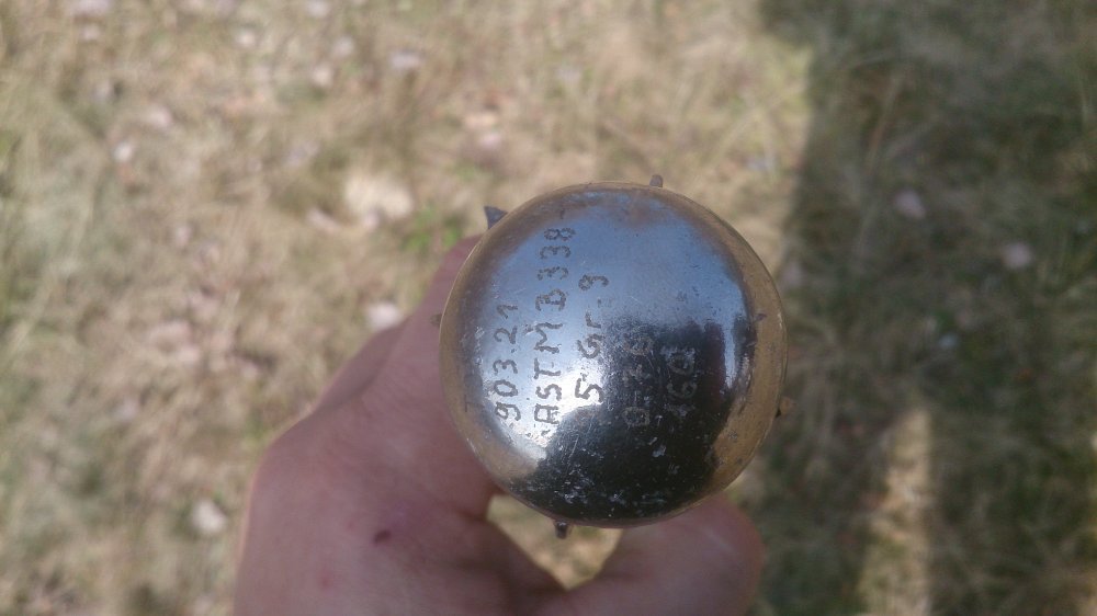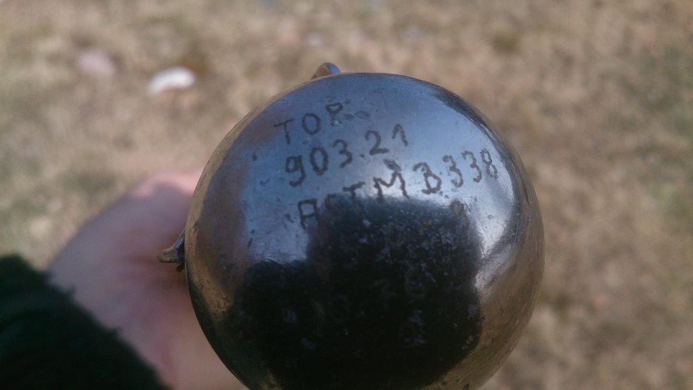 Bergen Svart igår klokken 09:06 Link til dette innlegget Svart igår klokken 09:06 Skriften på inngravering av tall/bokstaver minner om hvordan dette var gjort på CO2 patroner i pulver brannslukkerapparater tidligere. Form og størrelse kan jo og indikere at dette er noe slikt, men problemet er at det ikke virker å være noe naturlig sted å punktere den. Sitér dette innlegget Link to post